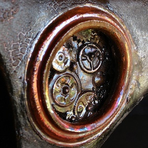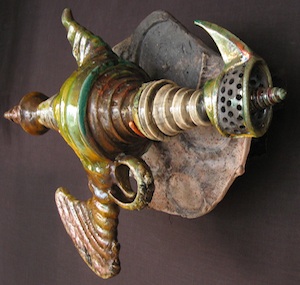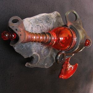 Raku Ray Guns are one-of-a-kind ceramic sculptures made by West Magoon. They are inspired by alien technology unearthed at a secret UFO crash site, known only to a tribe of Wyoming Hill People. One source (Tinkergirl at Brassgoggles), proclaims that these sculptures are soundly stationed in the pulp end of the Steampunk spectrum.
